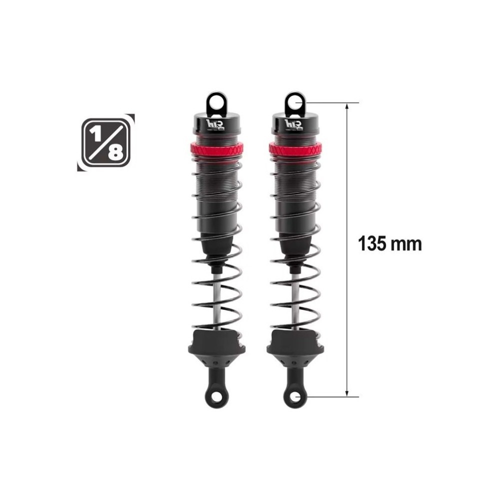 Celohliníkové olejové tlumiče pro modely 1/8 a podobné, Celková délka mezi čepy je 135mm, průměr pístku je 16mm. Sada obsahuje: tři páry pružin: měkké, střední a tvrdé; horní i spodní upevňovací materiál.