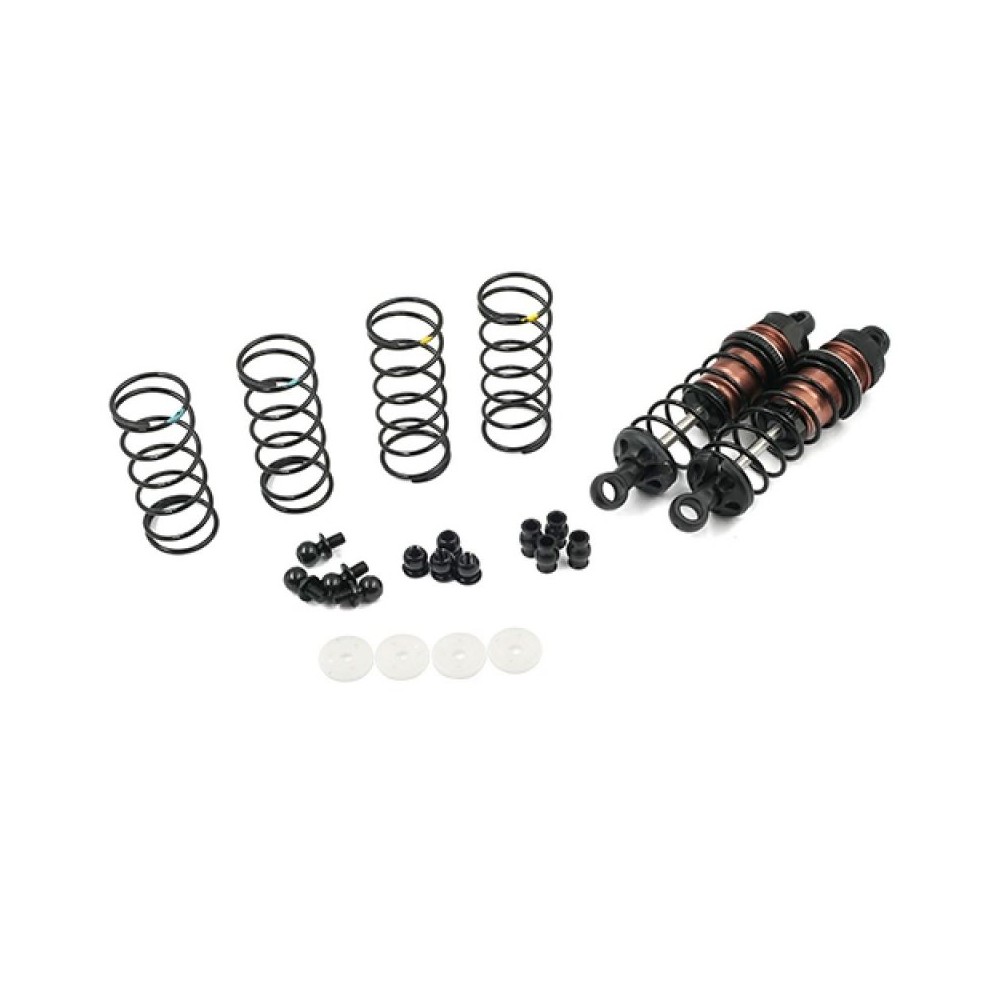 Big Bore Go! sada velkoobjemových tlumičů - přidejte olej a můžete vyrazit! Obsahuje dva různé typy kulových čepů pro různé typy vozů. Součástí jsou různé pružiny, abyste si mohli vyladit tvrdost odpružení a nemuseli po zakoupení této sady tlumičů hledat jiné pružiny. Pokud to s laděním myslíte opravdu vážně, jsou součástí balení také pístky s různým vrtáním, abyste mohli nastavit, jak tlumič reaguje na tlumicí olej.