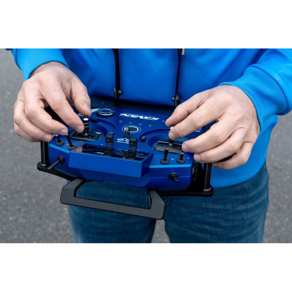Robustní vysílačový pult pro KAVAN V15. Precizní ergonomické zpracování, snadná a rychlá montáž. Hmotnost 390 g, rozměry 160×305×90 mm. Matná černá barva. Výroba v Česku.