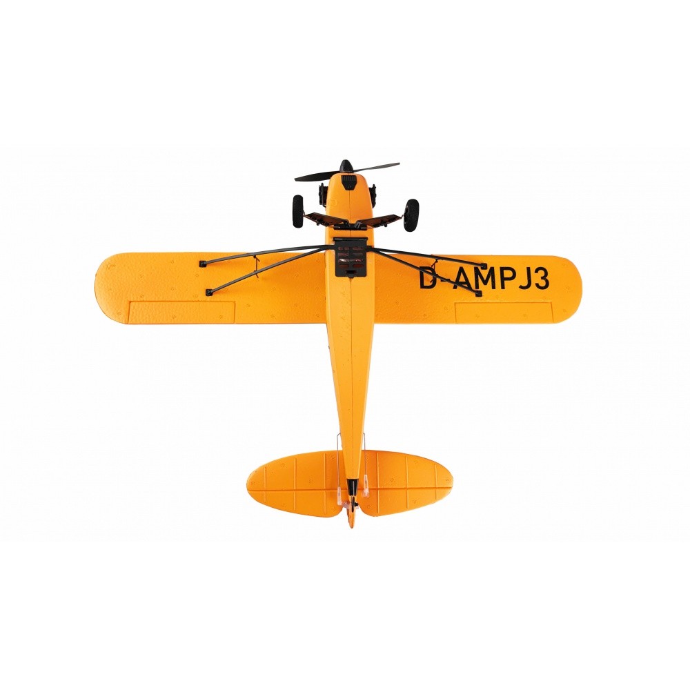 Replika Piper J-3 CUP s vynikajícími letovými vlastnostmi, která je vhodná zejména pro začátečníky díky vestavěnému šestiosému gyru (stabilizátoru letové polohy) a umožňuje všem začínajícím pilotům zažít bezpečný let. Gyro neutralizuje téměř všechny vnější vlivy, jako je vítr - i chyby model se vyrovná, když se ovládací páky jednoduše vrátí do neutrální polohy. Snímač polohy zároveň zabraňuje pádu v gyroskopickém režimu (max. stoupání a klesání cca 15-20°). Jako 3-kanálový model je Piper J-3 CUP ovládán motorem, směrovkou, výškovkou. Celá konstrukce je vyrobena z téměř nezničitelného materiálu EPP. Tvrdší přistání nebo drobné havárie jsou tedy většinou bez poškození, což umožňuje dlouhodobou zábavu z létání. Speciálně pro tento model byla vyvinuta vrtule z nárazuvzdorného plastu. Odolnost a účinnost jsou naprosto vynikající - ve spojení s výkonným pohonem je k dispozici pozoruhodný letový výkon. Rychlá digitální serva s 0,08 sekundy / 60° zajišťují přímý a přesný pocit z řízení. Než může začít první let, zbývá už jen sestavit křídla a podvozek. Model Piper J-3 Cup je dodáván jako RTF (připraven k letu), po nabití můžete startovat!