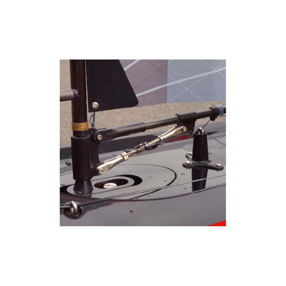 Dvoudílný stěžeň je z uhlíkové trubky stejně jako ráhna; konce dílů stěžně jsou proti rozlomení chráněny kovovými kroužky. Ráhno hlavní plachty se stavitelnou vzpěrou je uloženo na dvou kuličkových ložiscích. Plachty jsou vyrobeny z pevné syntetické tkaniny (Dacronu) odolné proti roztržení, cípy plachet jsou zesíleny nalepenou plastovou fólií. Nepohyblivé lanoví (ze super pevných nití Dyneema) s obvyklými napínáky umožňuje nastavovat polohu stěžně v širokém rozmezí, posuvná je také patka stěžně.