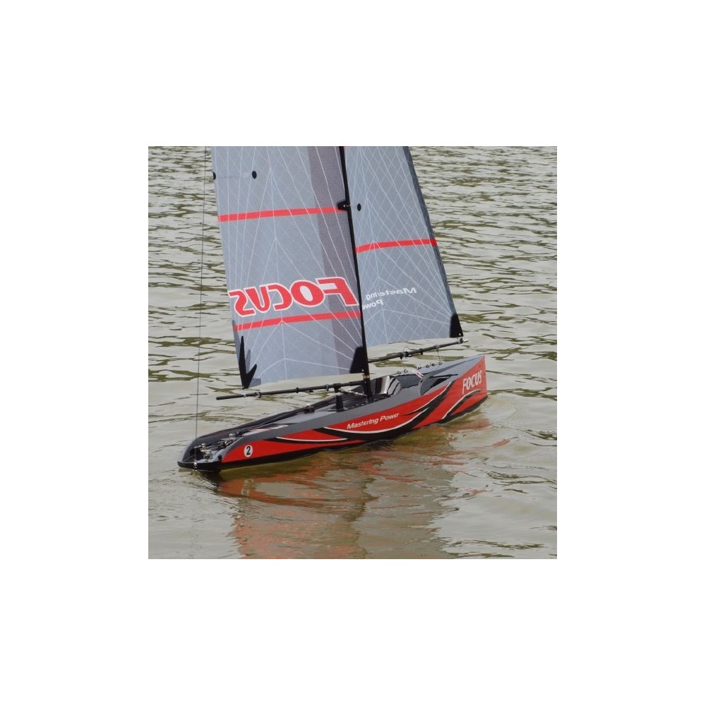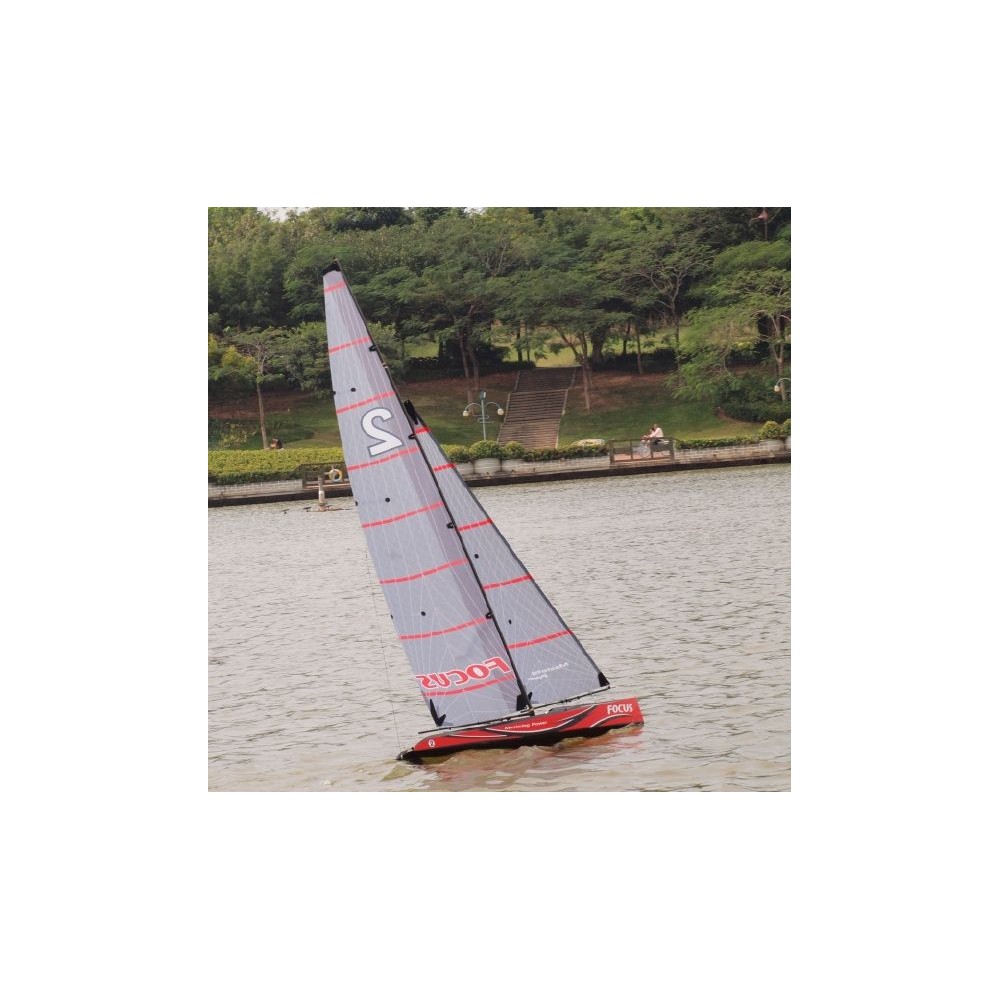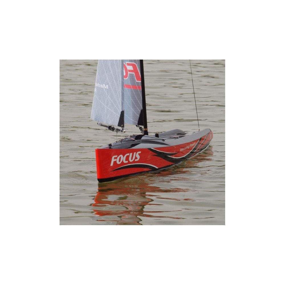 FOCUS II je model plachetnice soutěžní plachetnice třídy 1M, se kterým si výborně zajezdíte na každé větší vodní ploše. I přes větší rozměry („metrový“ trup a celková výška 2046 mm) je to díky snadno demontovatelnému dvoudílnému stěžni a kýlu jednoduše přepravitelný věrný společník na víkendové výpravy nebo dovolenou u vody. Stačí jenom čtyři tužkové alkalické baterie nebo akumulátory do vysílače a čtyři pro přijímač, upevnit stěžeň, kýl, kormidlo a plachty - a můžete vyrazit. FOCUS II je totiž dodáván jako RC set - předmontovaná plachetnice s nainstalovanou elektronikou a čtyřkanálovým proporcionálním vysílačem 2.4GHz.