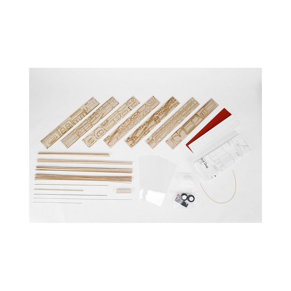Stavebnice obsahuje: balsové laserem vyřezávané díly, balsové nosníky, vakuově lisované díly (kryt motoru...), čirou plastovou fólii na "zasklení" kabiny, ocelovou strunu na podvozek a další drobné díly, lehká pěnová kola, barevný potahový papír, aršík samolepek, stavební plán.