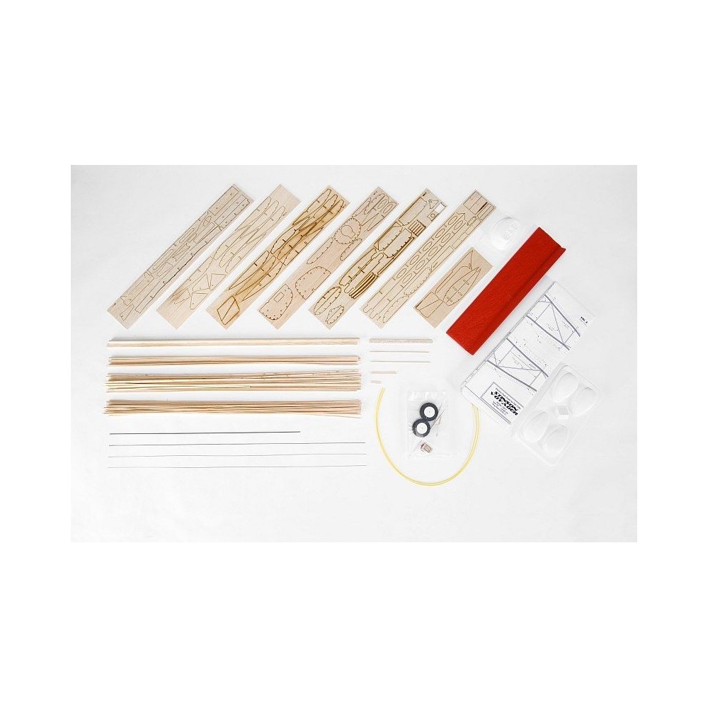 Stavebnice obsahuje: balsové laserem vyřezávané díly, balsové nosníky, vakuově lisované díly (kryt motoru...), čirou plastovou fólii na "zasklení" kabiny, ocelovou strunu na podvozek a další drobné díly, lehká pěnová kola, barevný potahový papír, aršík samolepek, stavební plán.