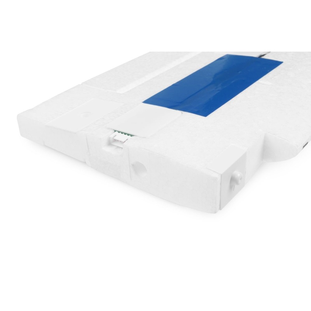 Křídlo modelu z pěnového EPO je dvojdílné s uhlíkovými nosníky a uhlíkovou trubkovou spojkou. Na místě je zajištěno šrouby. Křidélka i klapky jsou ovládány nezávisle vždy dvěma servy s krátkými přímými drátovými táhly a nechybí ani funkční poziční a přistávací LED světla. Snadno demontovatelné uhlíkové vzpěry křídla jsou zajištěny na místě páry drátových sponek.