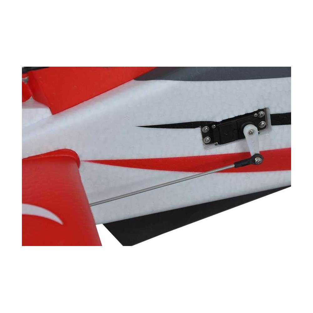 Dvoudílné křídlo s polosouměrným profilem spojené uhlíkovou trubkou je rovněž z pěnového EPP. Křidélka a štěrbinové vztlakové klapky jsou ovládány krátkými přímými táhly dvěma páry serv upevněnými v křídle.