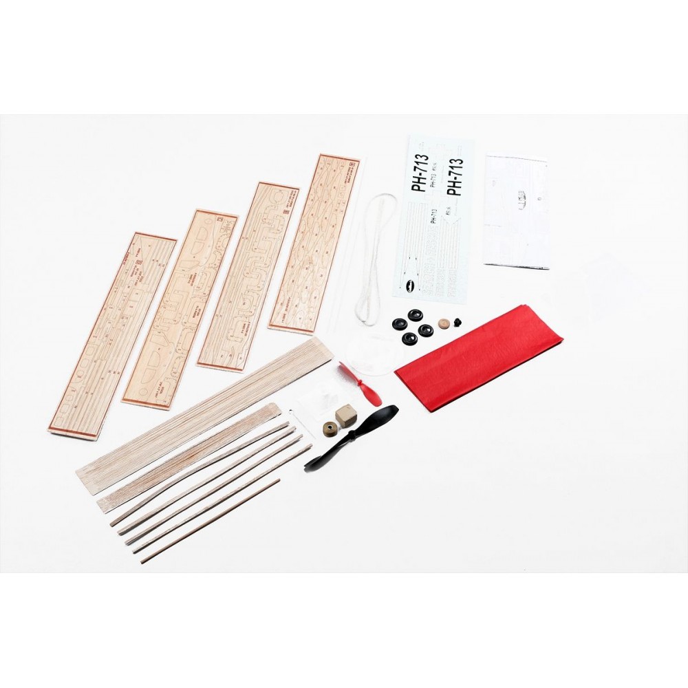 Stavebnice obsahuje: balsové laserem vyřezávané díly, balsové nosníky, vakuově lisované maketové díly (kryt motoru...), plastovou vrtuli s hřídelí a hlavicí, gumový svazek (guma 5x1mm), plastová kola, ocelovou strunu na podvozek a další drobné díly, potahový papír, aršík mokrých obtisků, stavební plán.