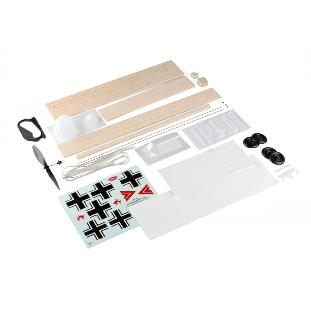 Stavebnice obsahuje: balsové předseknuté díly, balsové nosníky, vakuově lisované maketové díly (kryt motoru...), plastovou vrtuli s hřídelí a hlavicí, gumový svazek (guma 5x1mm), plastová kola, ocelovou strunu na podvozek a další drobné díly, plastová kola, potahový papír, aršík mokrých obtisků, stavební plán.