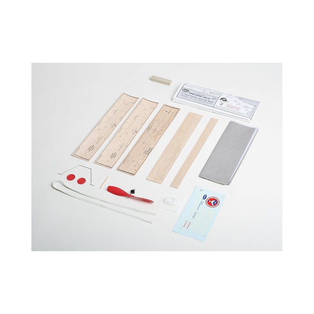 Stavebnice obsahuje: balsové předseknuté díly, balsové nosníky, vakuově lisované díly (kryt motoru), plastovou vrtuli s hřídelí a hlavicí, gumový svazek, plastová kola, ocelovou strunu na podvozek a další drobné díly, plastelínu jako zátěž, potahový papír, aršík mokrých obtisků, stavební plán.