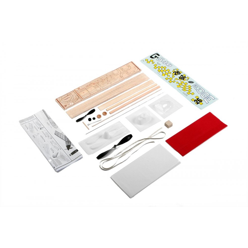 Stavebnice obsahuje: balsové laserem vyřezávané díly díly, balsové nosníky, vakuově lisované maketové díly (kryt motoru, kryty kol...), výlisek kabiny, plastovou vrtuli s hřídelí a hlavicí, gumový svazek (guma 5x1mm), plastová kola, ocelovou strunu na podvozek a další drobné díly, červený a bílý potahový papír, aršík mokrých obtisků, stavební plán.