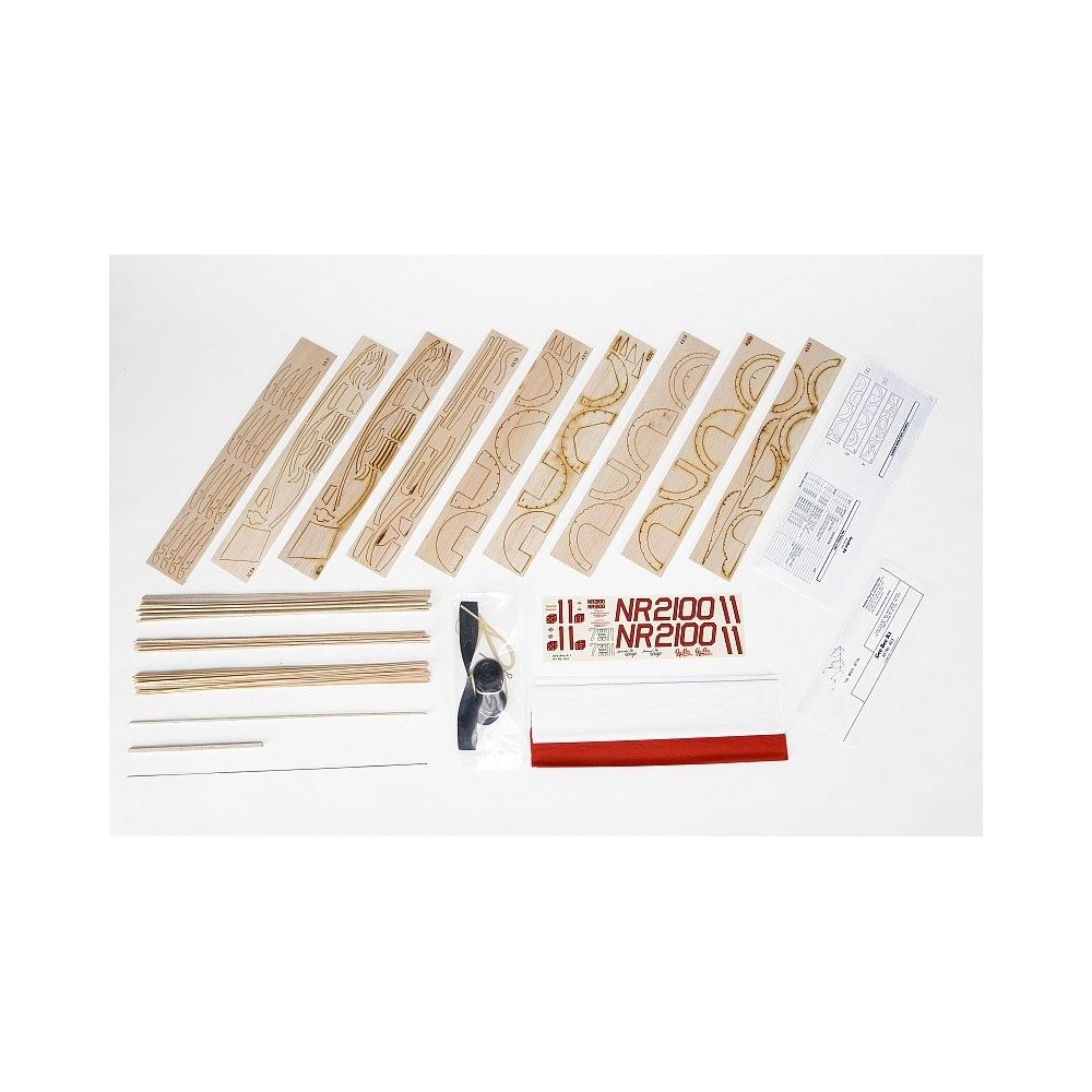 Stavebnice obsahuje: balsové laserem vyřezávané díly, balsové nosníky, vakuově lisované díly (kryt motoru, kryt kabiny...), plastovou vrtuli s hřídelí a hlavicí, gumový svazek (soutěžní guma FAI TAN II), kola, ocelovou strunu na podvozek a další drobné díly, barevný potahový papír, aršík samolepek, stavební plán.