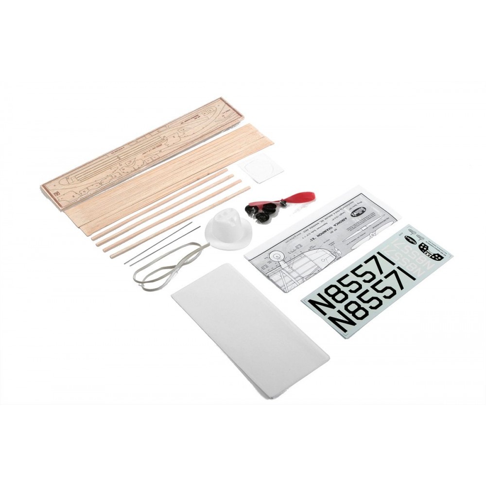 Stavebnice obsahuje: balsové laserem vyřezávané díly, balsové nosníky, vakuově lisované maketové díly (kryt motoru...), plastovou vrtuli s hřídelí a hlavicí, gumový svazek (guma 5x1mm), plastová kola, ocelovou strunu na podvozek a další drobné díly, plastová kola, potahový papír, aršík mokrých obtisků, stavební plán.