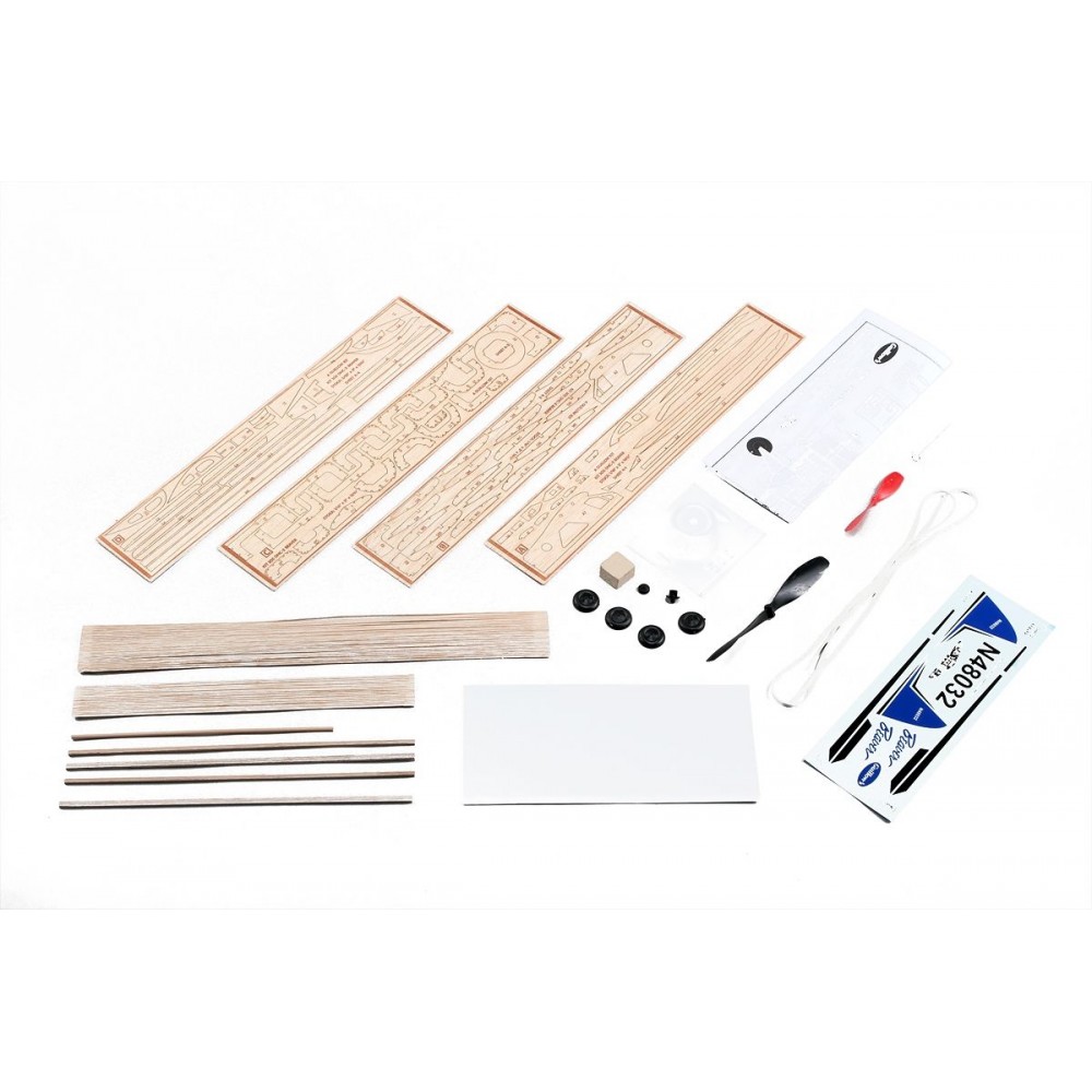 Stavebnice obsahuje: balsové laserem vyřezávané díly, balsové nosníky, vakuově lisované maketové díly (kryt motoru...), plastovou vrtuli s hřídelí a hlavicí, gumový svazek (guma 5x1mm), plastová kola, ocelovou strunu na podvozek a další drobné díly, potahový papír, aršík mokrých obtisků, stavební plán a návod.