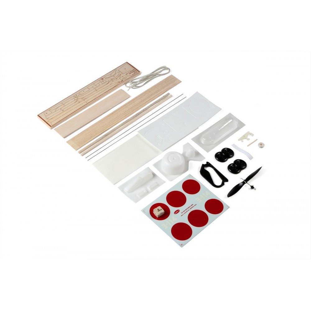 Stavebnice obsahuje: balsové laserem vyřezávané díly, balsové nosníky, vakuově lisované maketové díly (kryt motoru, kabiny...), plastovou vrtuli s hřídelí a hlavicí, gumový svazek (guma 5x1mm), plastová kola, ocelovou strunu na podvozek a další drobné díly, plastová kola, potahový papír, aršík mokrých obtisků, stavební plán.