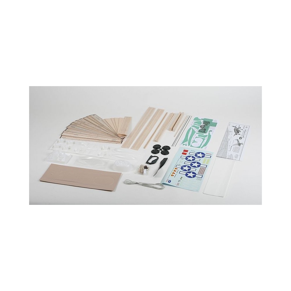 Maketa amerického stíhacího letadla z II. sv. války s gumovým pohonem nebo upoutaný model pro motor 1,5ccm. Vysekávané díly. Rozpětí 768 mm. Vhodná pro konverzi na RC elektru.