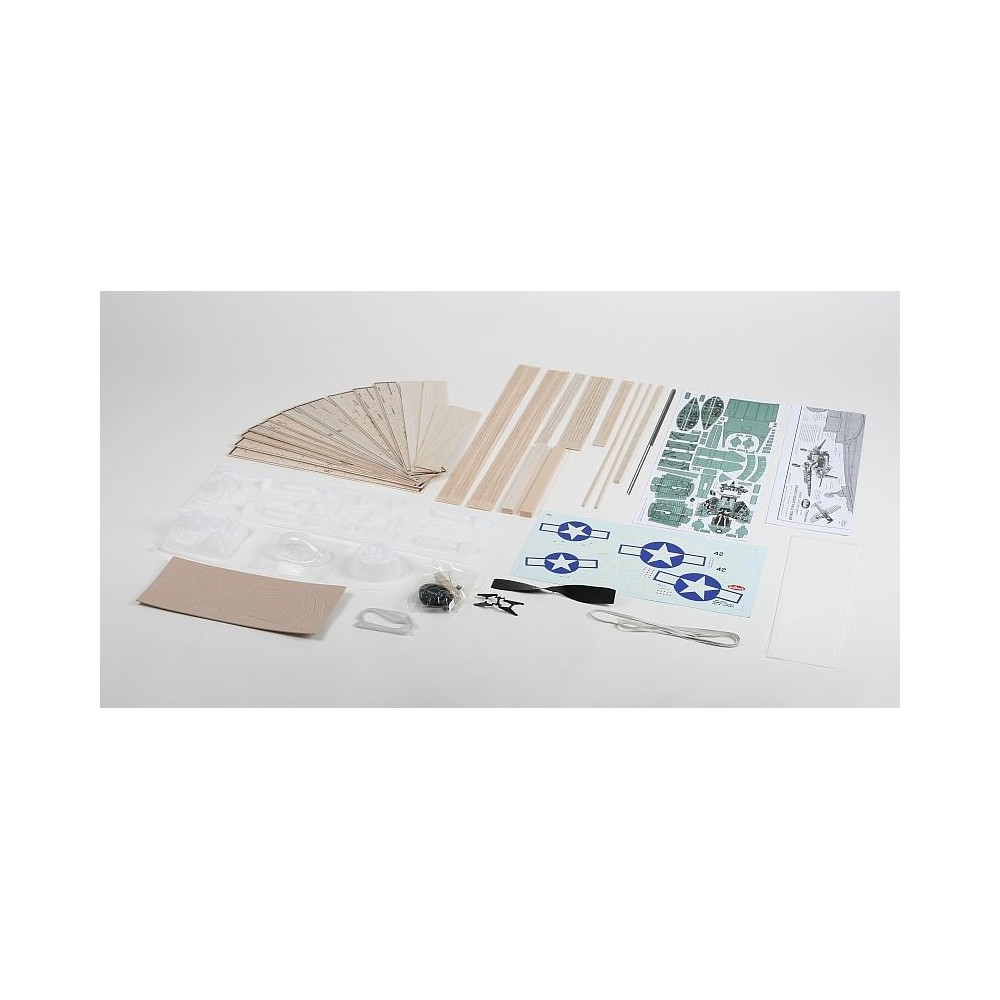 Stavebnice obsahuje: balsové předseknuté díly, balsové nosníky, předseknuté díly z plastikové překližky, vakuově lisované maketové díly (kryt motoru, motor...), čirý acetátový výlisek krytu kabiny, plastovou vrtuli s hřídelí a hlavicí, gumový svazek (guma 5x1mm), ocelovou strunu na podvozek a další drobné díly, plastová kola, potahový papír, rukojeť a vahadlo pro upoutaný model, velký aršík mokrých obtisků, stavební plán.