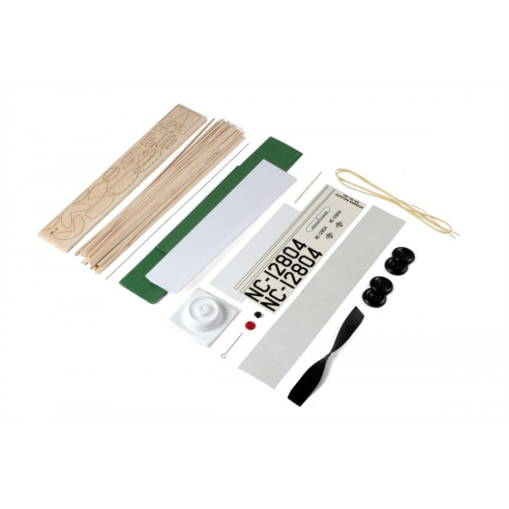 Stavebnice obsahuje: balsové laserem vyřezávané díly, balsové nosníky, vakuově lisované díly (kryt motoru, kryt kabiny...), plastovou vrtuli s hřídelí a hlavicí, gumový svazek (soutěžní guma FAI TAN II), kola, ocelovou strunu na podvozek a další drobné díly, barevný potahový papír, aršík samolepek, stavební plán.