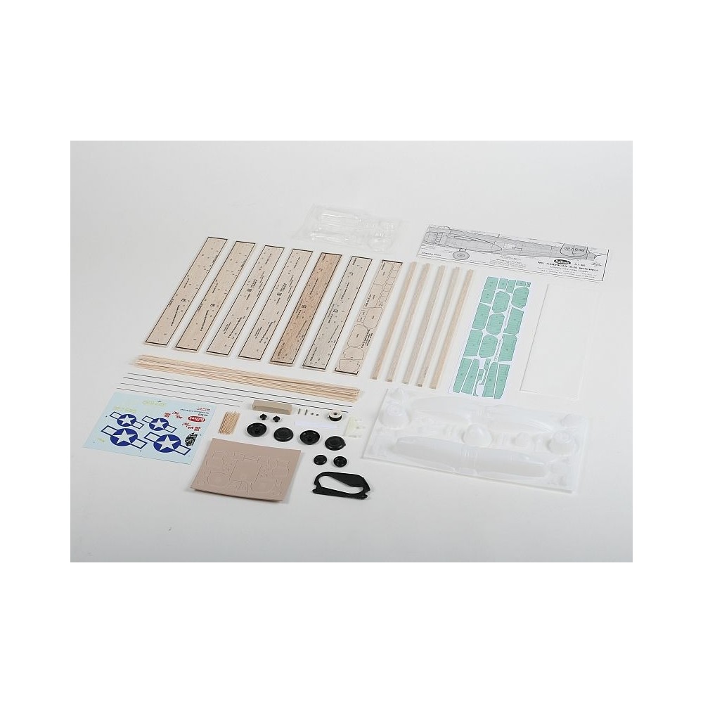 Stavebnice obsahuje: balsové předseknuté díly, balsové nosníky, předseknuté díly z plastikové překližky, vakuově lisované maketové díly (kryty motorů, kabiny...), ocelovou strunu na podvozek a další drobné díly, plastová kola, potahový papír, rukojeť a vahadlo pro upoutaný model, aršík mokrých obtisků, stavební plán.