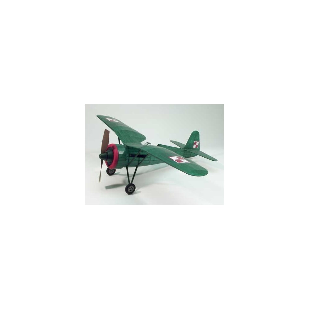 Stavebnice volně létající polomakety polského stíhacího hornoplošníku určená pro pohon gumovým svazkem. Model je klasické celobalsové konstrukce v rozsypu s laserem vyřezávanými dřevěnými díly, maketovými doplňky z vakuově tvářeného plastu a plastovými díly zhotovenými vstřikovým lisováním. Trup je konstruován pravou minimaketářskou technologií s přepážkami a velkým množstvím podélníků, které umožňují věrně reprodukovat oblé tvary moderních strojů. Staví ve dvou krocích - díky "rozříznutí" ve svislé rovině postavíte přímo na pracovní desce nejprve jednu polovinu trupu, a k ní poté "dolepíte" polovinu druhou. Tak je zajištěno, že i trup komplikovaných tvarů postavíte rovný a souměrný, bez potřeby jakýchkoliv speciálních přípravků. Křídlo je klasické konstrukce z nosníků a žeber, ocasní plochy z balsových lišt a laserem vyřezávaných dílů.
