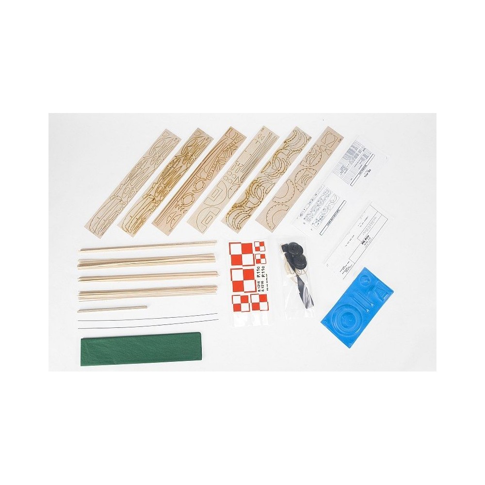 Stavebnice obsahuje: balsové laserem vyřezávané díly, balsové nosníky, vakuově lisované díly (kryt motoru, kryt kabiny...), plastovou vrtuli s hřídelí a hlavicí, gumový svazek (soutěžní guma FAI TAN II), kola, ocelovou strunu na podvozek a další drobné díly, barevný potahový papír, aršík samolepek, stavební plán.
