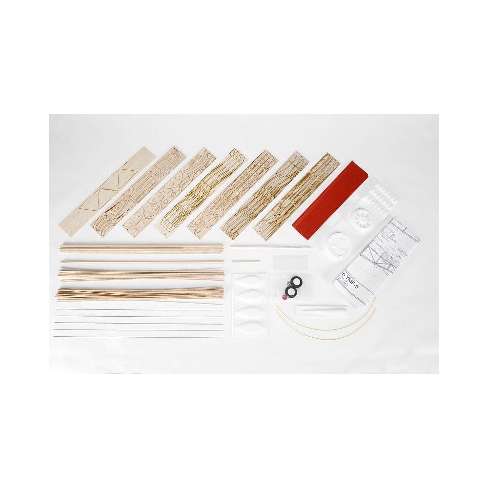 Stavebnice obsahuje: balsové laserem vyřezávané díly, balsové nosníky, vakuově lisované díly (kryt motoru...), čirou plastovou fólii na větrný štítek, ocelovou strunu na podvozek a další drobné díly, lehká pěnová kola, barevný potahový papír, aršík samolepek, stavební plán.