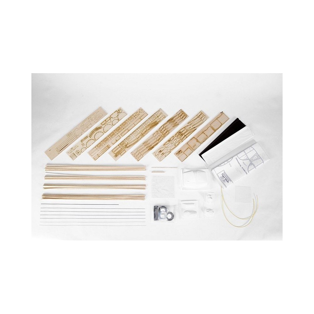 Stavebnice obsahuje: balsové laserem vyřezávané díly, balsové nosníky, vakuově lisované díly (kryt motoru...), čirou plastovou fólii na větrný štítek, ocelovou strunu na podvozek a další drobné díly, lehká pěnová kola, barevný potahový papír, aršík samolepek, stavební plán.