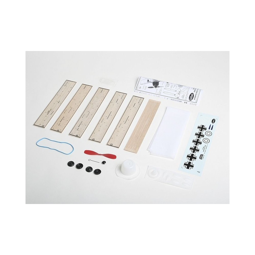 Stavebnice obsahuje: balsové předseknuté díly, balsové nosníky, vakuově lisované díly (kryt motoru, kryt kabiny...), plastovou vrtuli s hřídelí a hlavicí, gumový svazek, kola, ocelovou strunu na podvozek a další drobné díly, potahový papír, aršík mokrých obtisků, stavební plán.