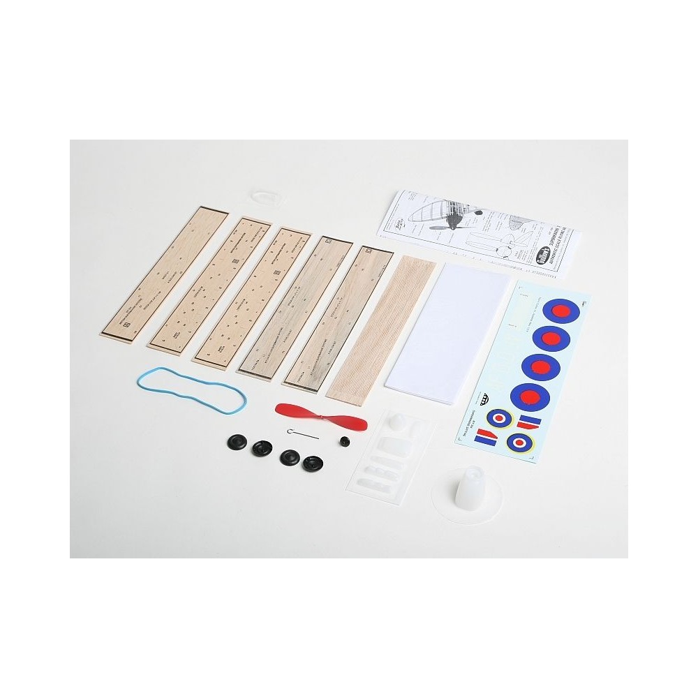 Stavebnice obsahuje: balsové předseknuté díly, balsové nosníky, vakuově lisované díly (kryt motoru, kryt kabiny...), plastovou vrtuli s hřídelí a hlavicí, gumový svazek, kola, ocelovou strunu na podvozek a další drobné díly, potahový papír, aršík mokrých obtisků, stavební plán.