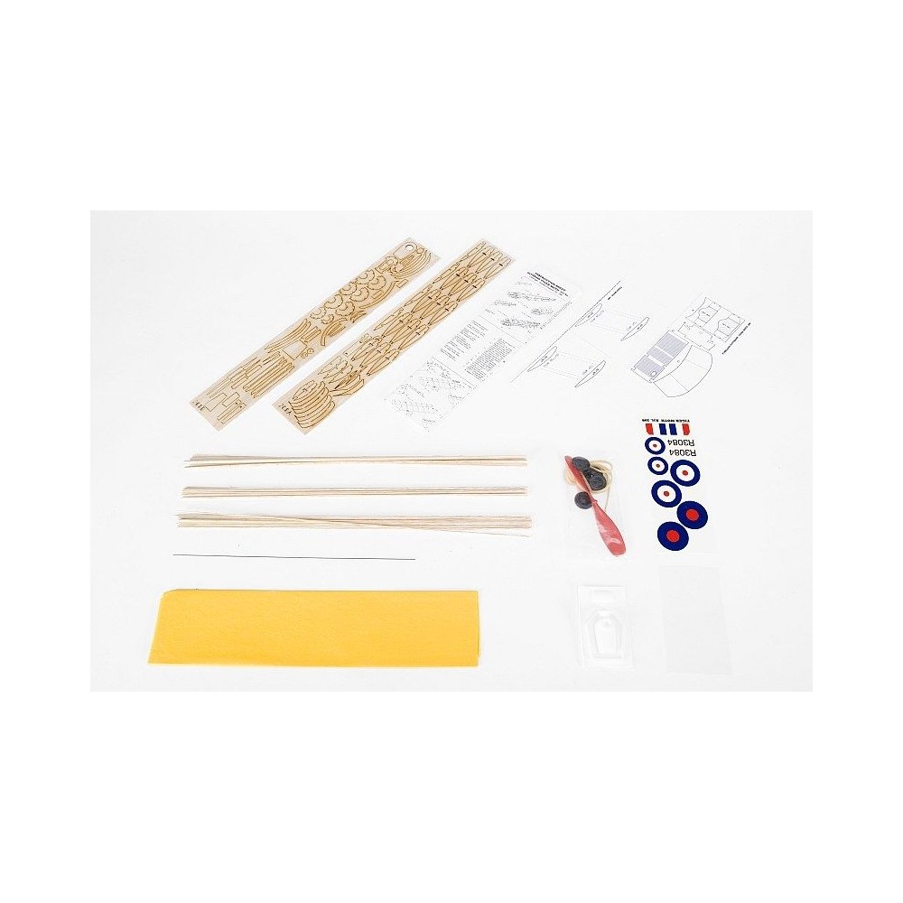 Stavebnice obsahuje: balsové laserem vyřezávané díly, balsové nosníky, vakuově lisované díly (kryt motoru, kryt kabiny...), plastovou vrtuli s hřídelí a hlavicí, gumový svazek (soutěžní guma FAI TAN II), kola, ocelovou strunu na podvozek a další drobné díly, barevný potahový papír, aršík samolepek, stavební plán.