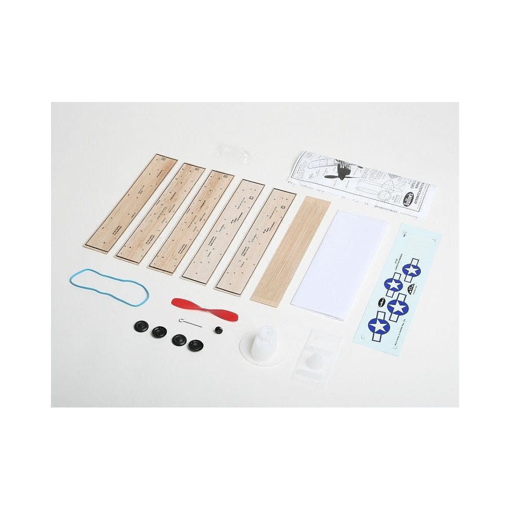 Minimaketa amerického stíhacího letadla z II. sv. války s gumovým pohonem. Vysekávané díly, vrtule, gumový svazek a potah. materiál. Rozpětí 419 mm.