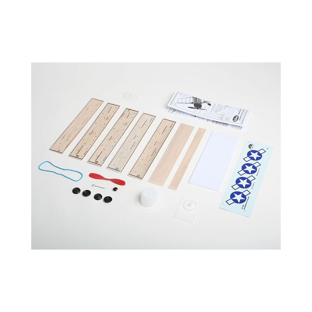 Stavebnice obsahuje: balsové předseknuté díly, balsové nosníky, vakuově lisované díly (kryt motoru, kryt kabiny...), plastovou vrtuli s hřídelí a hlavicí, gumový svazek, kola, ocelovou strunu na podvozek a další drobné díly, potahový papír, aršík mokrých obtisků, stavební plán.