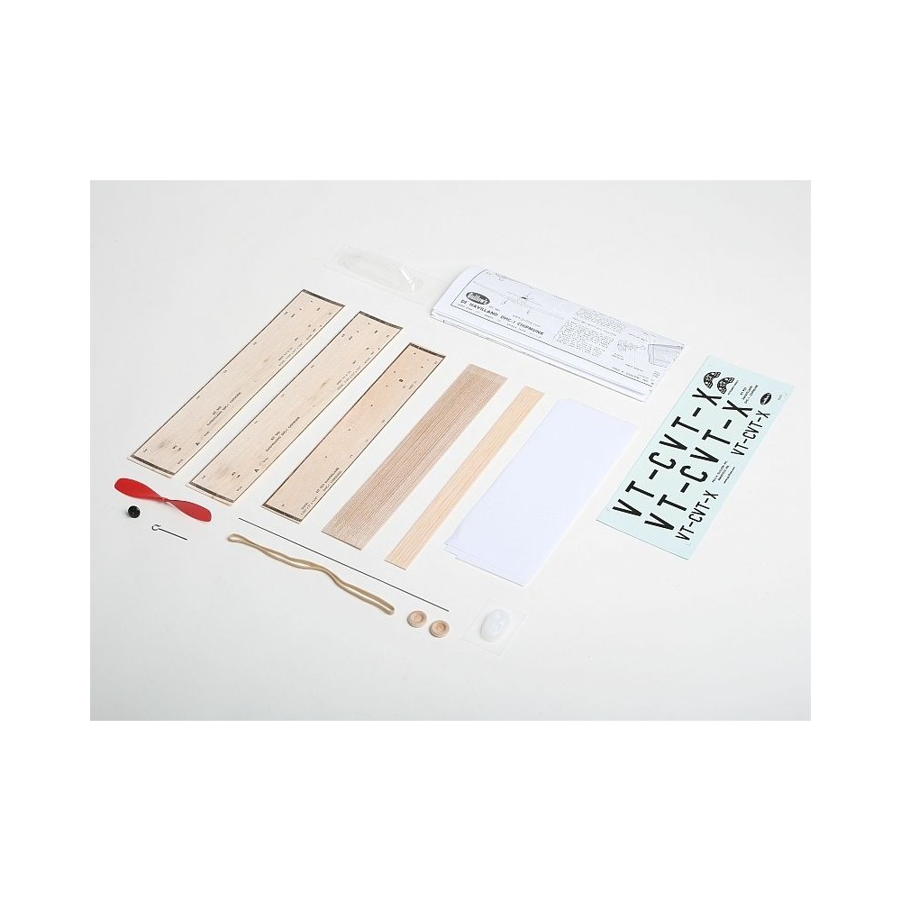 Stavebnice obsahuje: balsové předseknuté díly, balsové nosníky, vakuově lisované díly (kryt motoru, kryt kabiny), plastovou vrtuli s hřídelí a hlavicí, gumový svazek, vysoustružená balsová kola, ocelovou strunu na podvozek a další drobné díly, potahový papír, aršík mokrých obtisků, stavební plán.
