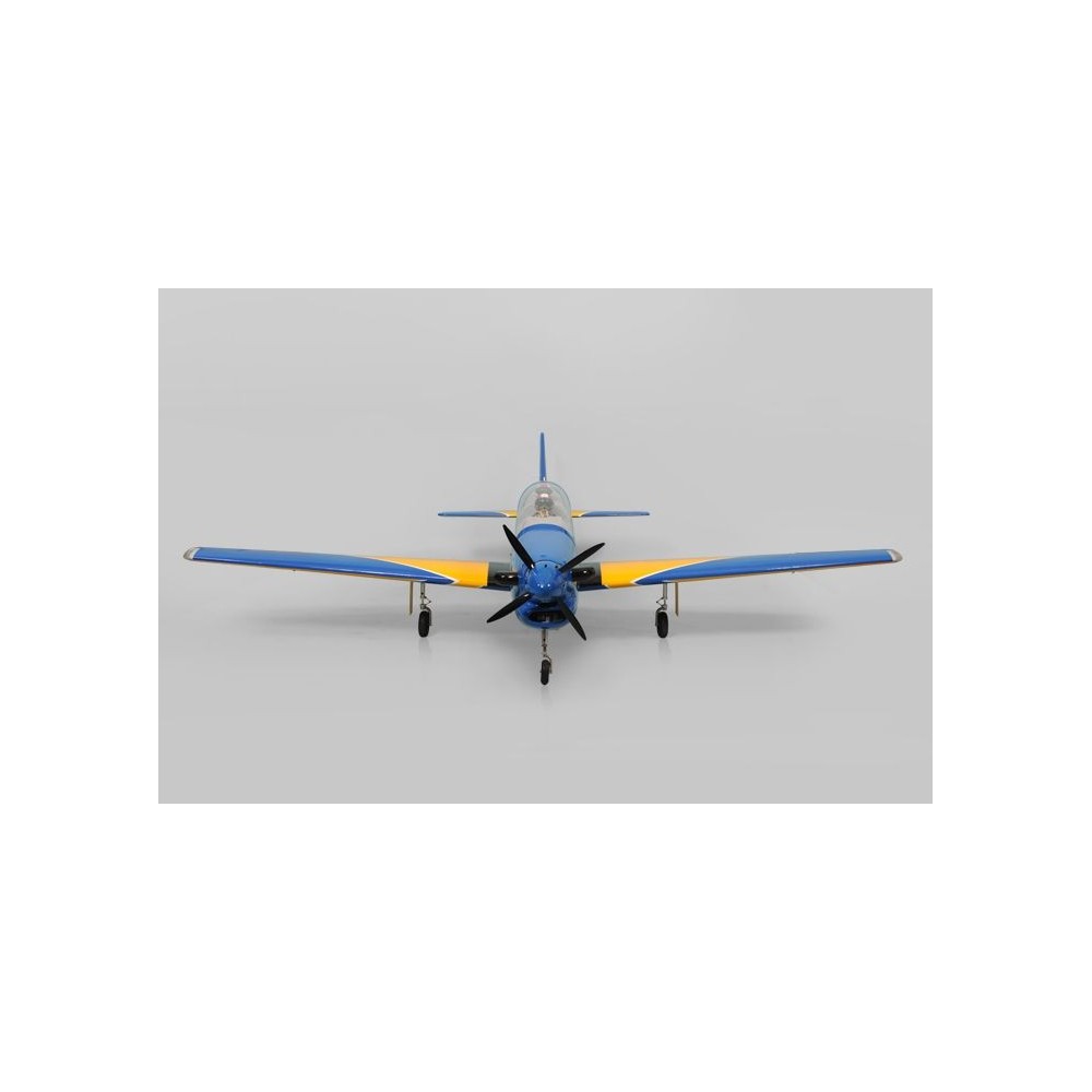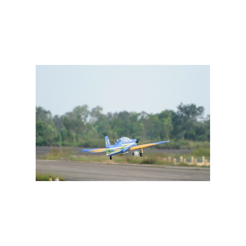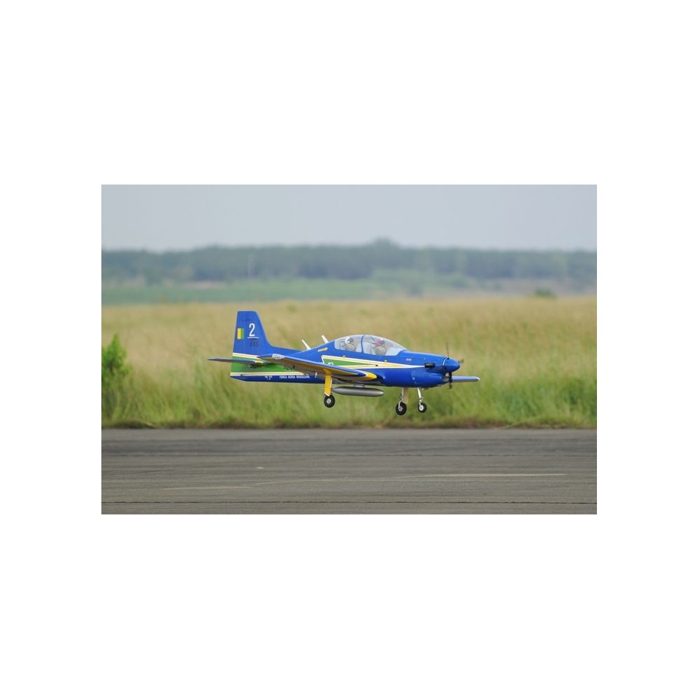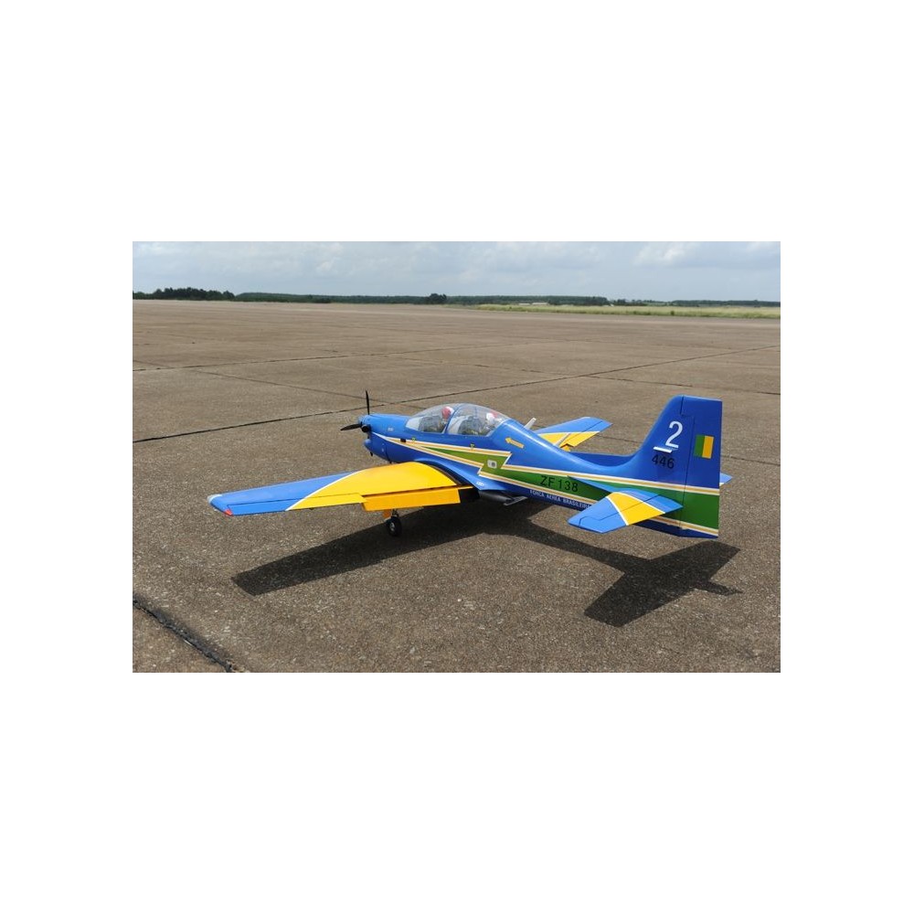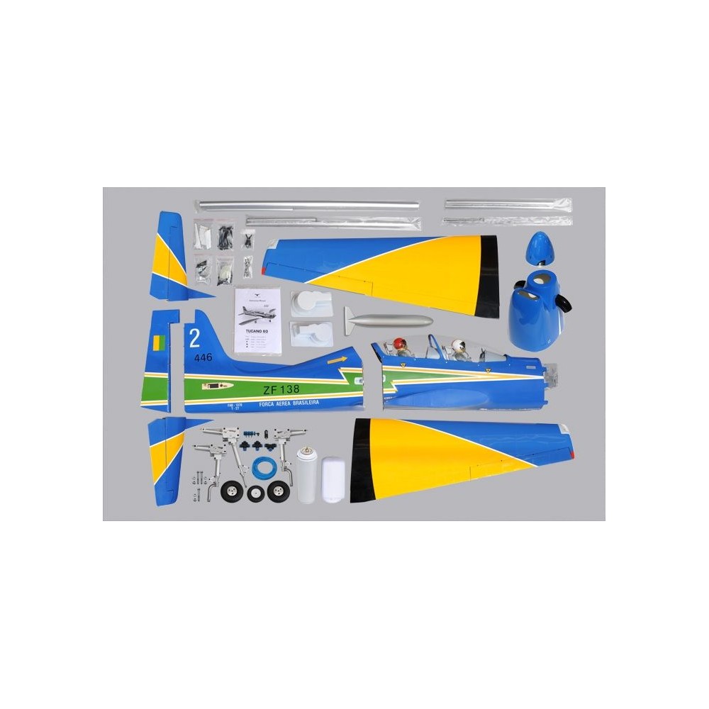 Polomaketa Embraer Tucano pro benzínové motory 50-60ccm. Konstrukční trup a nosné plochy, ovládaná křidélka, klapky, směrovka, výškovka, křídlo s polosouměrným profilem, pneumatický zatahovací podvozek.