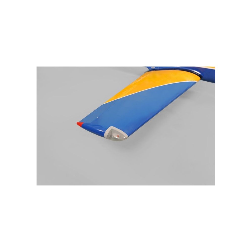 Dvoudílné křídlo se souměrným profilem je klasické konstrukce s balsovými žebry a tuhým potahem. Poloviny křídla se nasazují z boku na dvě duralové trubkové spojky. Křidélka i štěrbinové vztlakové klapky jsou ovládány vždy párem serv umístěných v křídle.