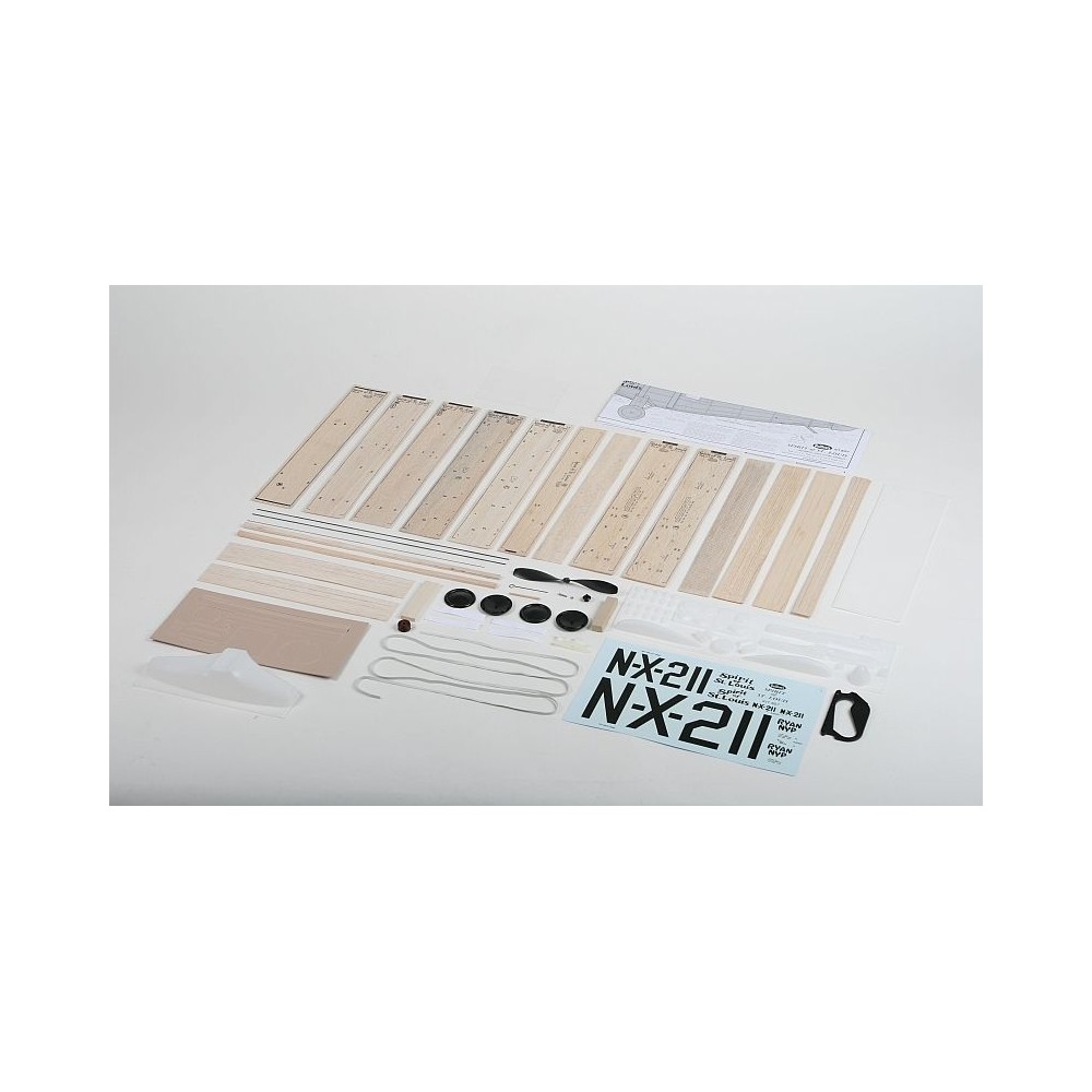 Stavebnice obsahuje: balsové předseknuté díly, balsové nosníky, předseknuté díly z plastikové překližky, vakuově lisované maketové díly (příď modelu, motor...), plastovou vrtuli s hřídelí a hlavicí, gumový svazek (guma 5x1mm), ocelovou strunu na podvozek a další drobné díly, plastová kola, potahový papír, rukojeť a vahadlo pro upoutaný model, aršík mokrých obtisků, stavební plán.