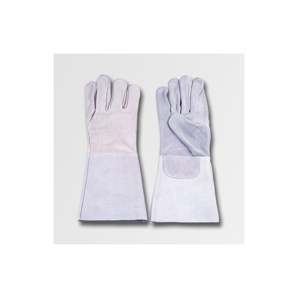Celokožené rukavice z šedé hovězí štípenky, tuhá manžeta 15cm, bez podšívky – certifikát pro svářečské práce.