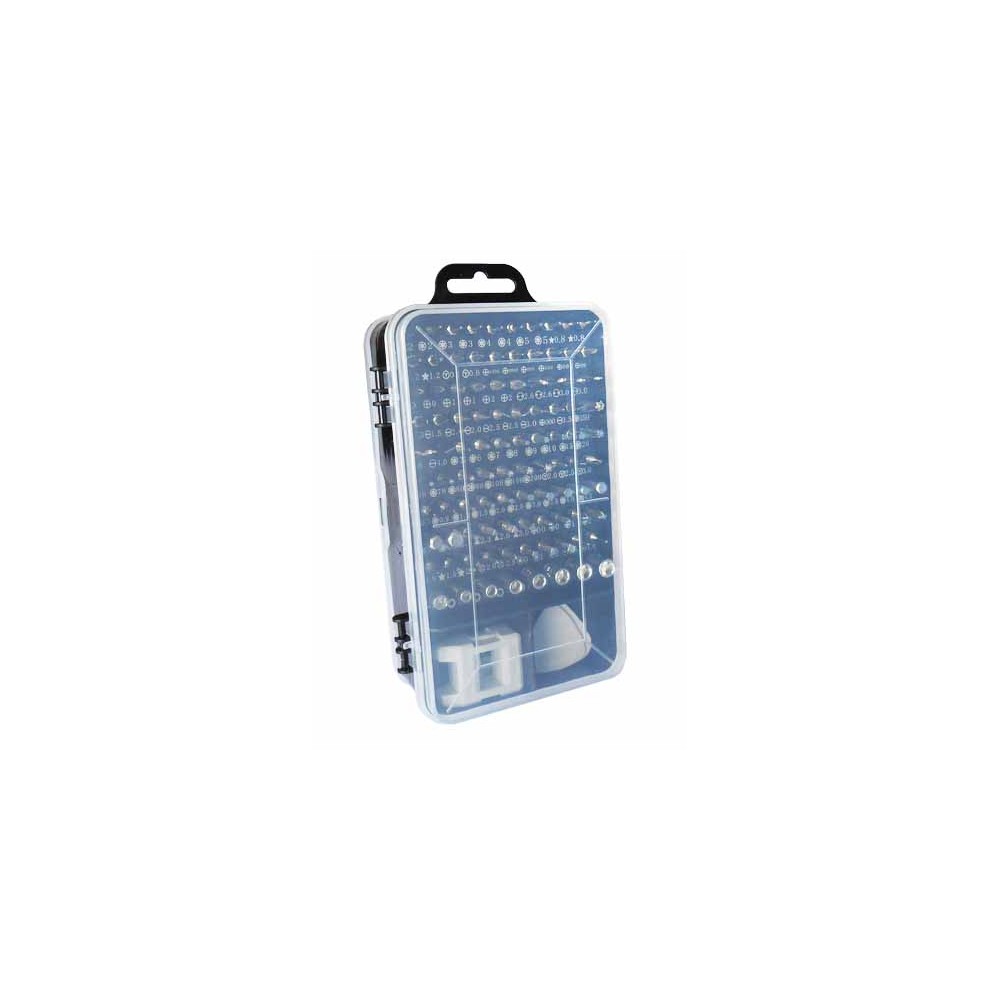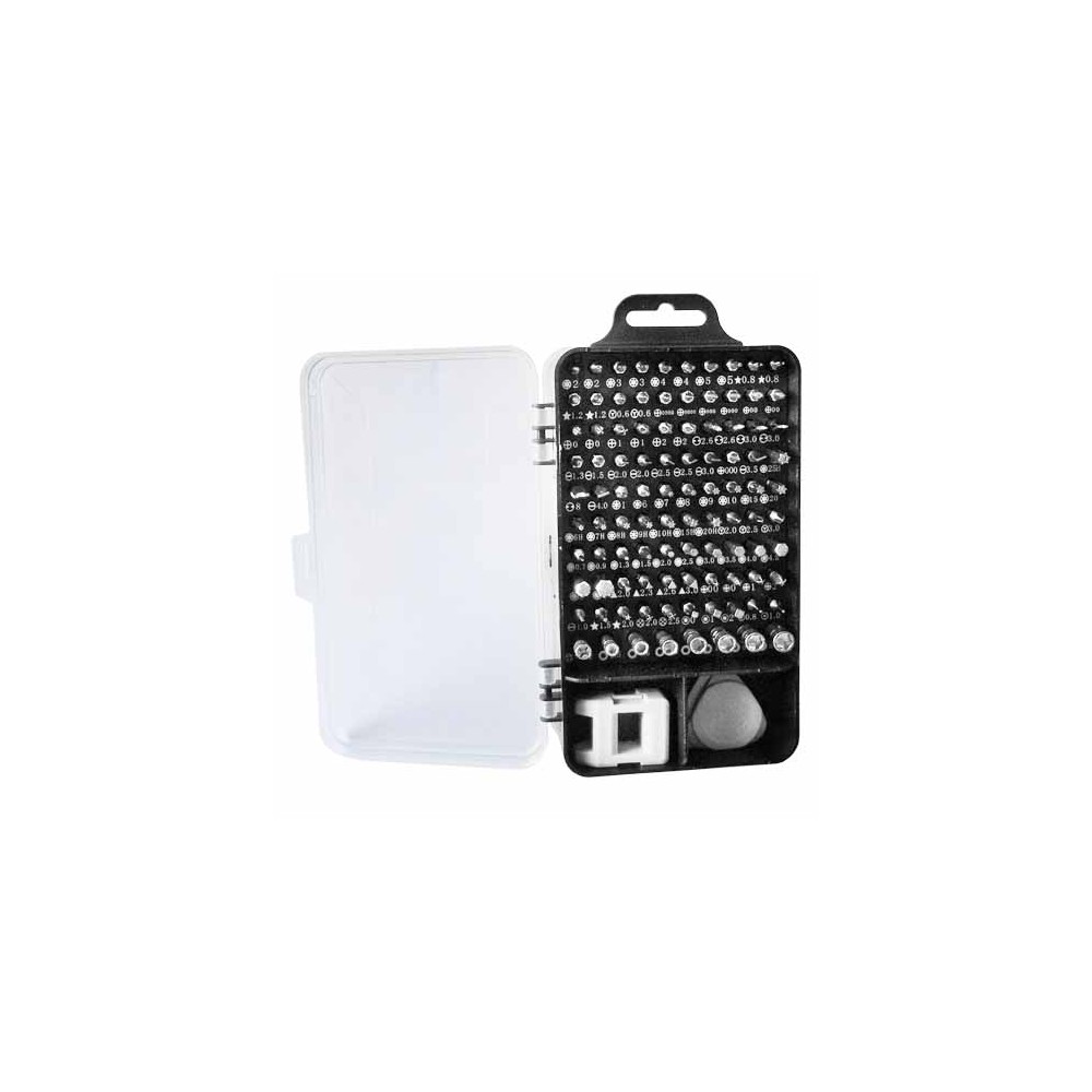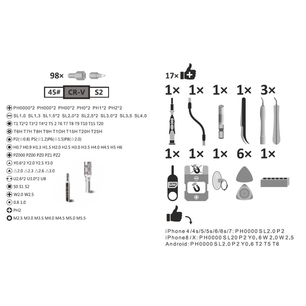 Sada obsahuje 17ks různých druhů nástrojů a 98ks bitů a nástavců vhodných například pro opravy mobilních telefonů a elektroniky.
