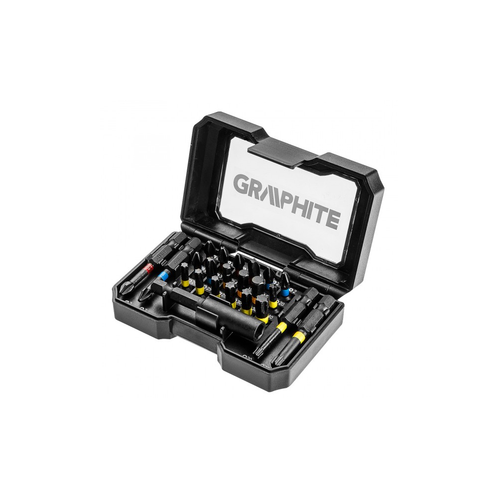 "Sada šroubovacích bitů, 23 ks, ocel S2, bity 25 mm - 18 ks, bity 50 mm - 4 ks, magnetický nástavec 1 ks Malá kompaktní sada nástavců GRAPHITE (ref. č. 56H612). Zúžené bity ohíbáním omezují sílu dotažení &ndash
