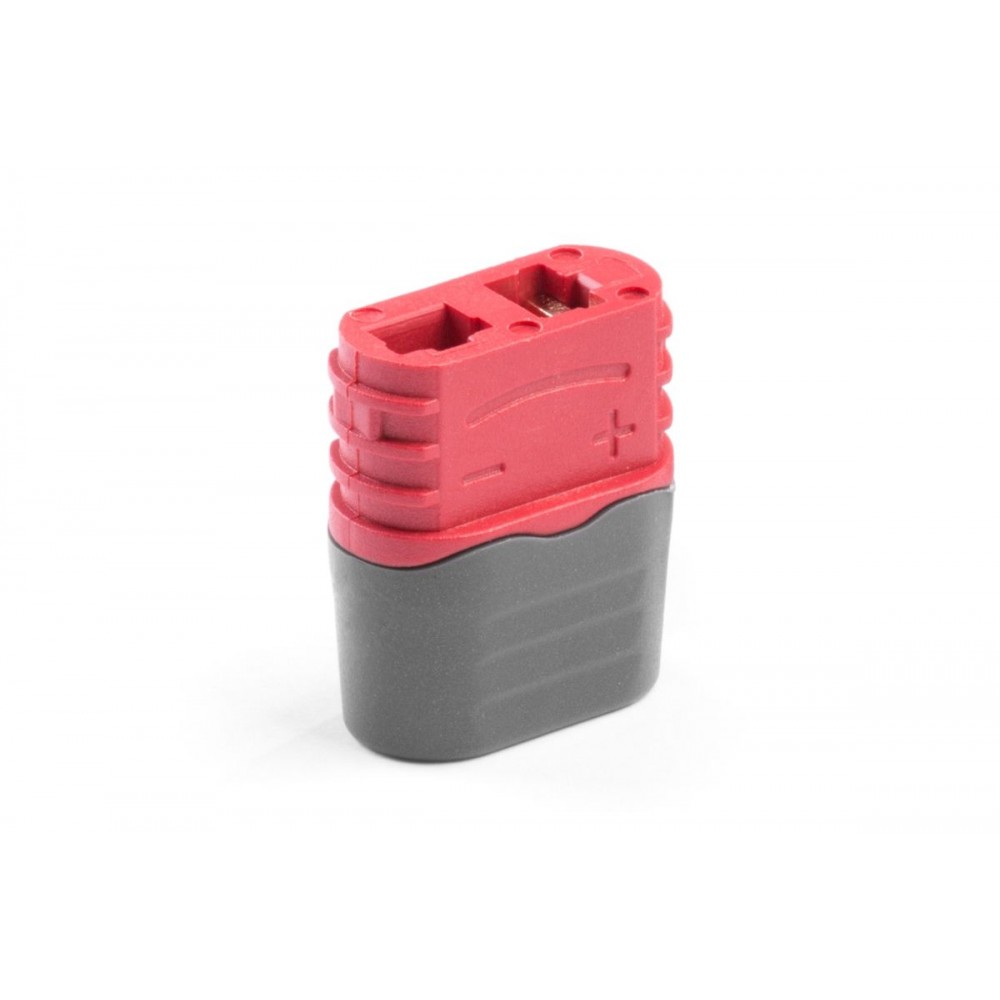 Dvoukolíkový silový konektor s plochými zlacenými kontakty se zatížitelností max. 50 A (dlohodobě 25A) se zaobleným drážkovaným tělem pro pevnější uchopení a kryty kabelů. Pro kabely o průřezu max. 3,3 mm2 (12AWG). Přechodový odpor 0,45 mOhm, max. 500 V. Balení 2ks s kryty kabelů.