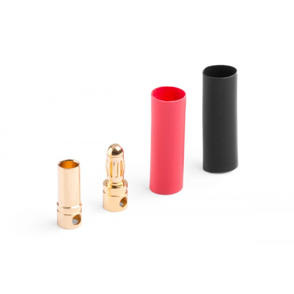 Silový zlacený konektor 3,5 mm s pružinovým kolíčkem se zatížitelností max. 50A (dlouhodobě 25A). Pro kabely o průřezu max. 2,1 mm2 (14AWG). Přechodový odpor 0,45 mOhm, max. 500 V. Balení 10 párů kolíček/dutinka se smršťovací bužírkou.