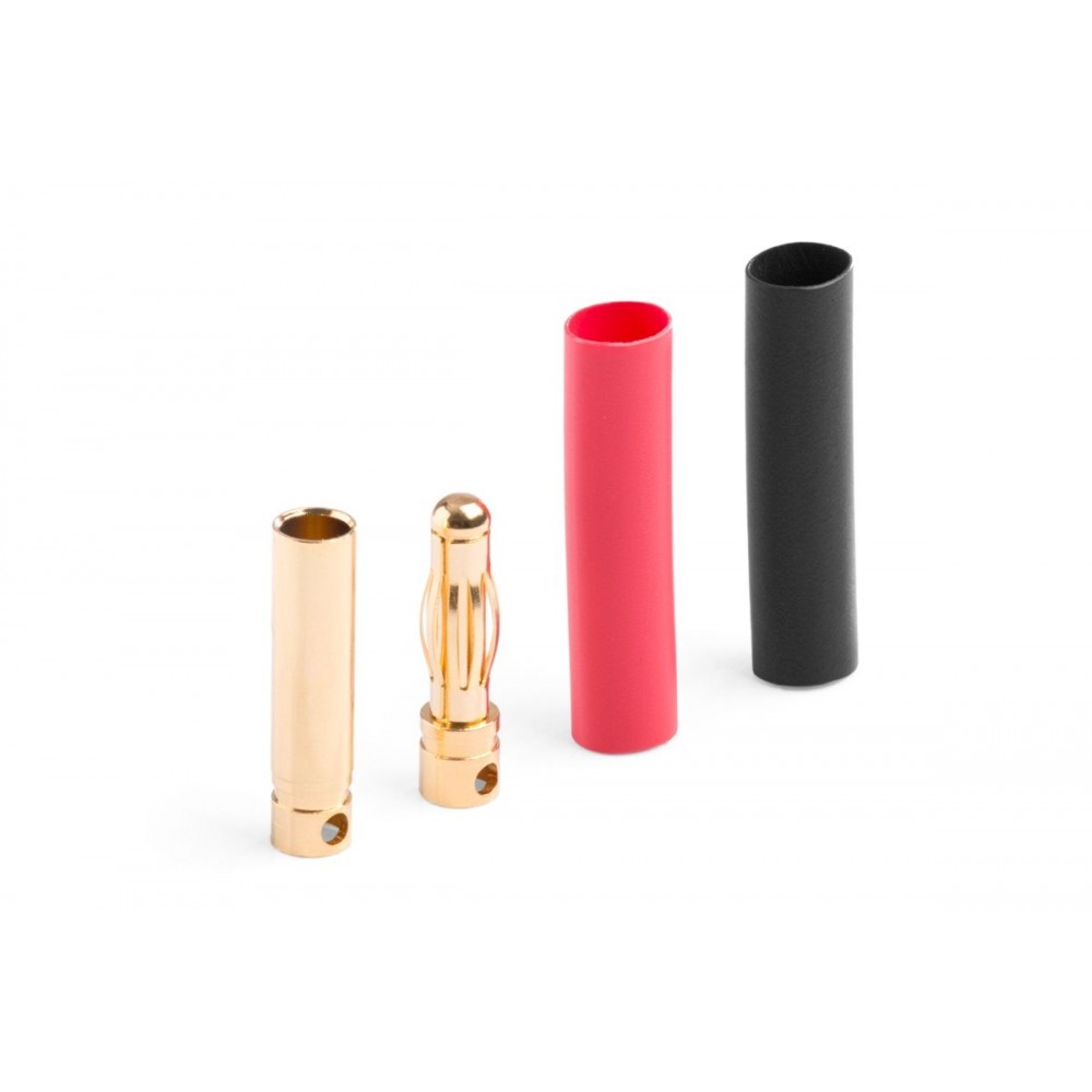 Silový zlacený konektor 4 mm s pružinovým kolíčkem se zatížitelností max. 70A (dlouhodobě 32A). Pro kabely o průřezu max. 2,6 mm2 (13AWG). Přechodový odpor 0,45 mOhm, max. 500 V. Balení 10 párů kolíček/dutinka se smršťovací bužírkou.