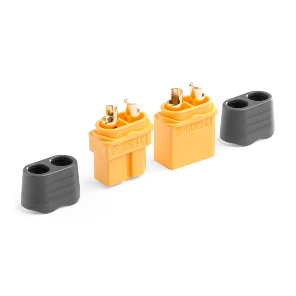 Dvoukolíkový silový konektor se 3,5 mm zlacenými kontakty se sníženým přechodovým odporem a zatížitelností max. 60 A s plastovými kryty kabelů. Pro kabely o průřezu max. 3,3 mm2 (12AWG). Přechodový odpor 0,50 mOhm, max. 500 V. Balení 1 pár s kryty kabelů.