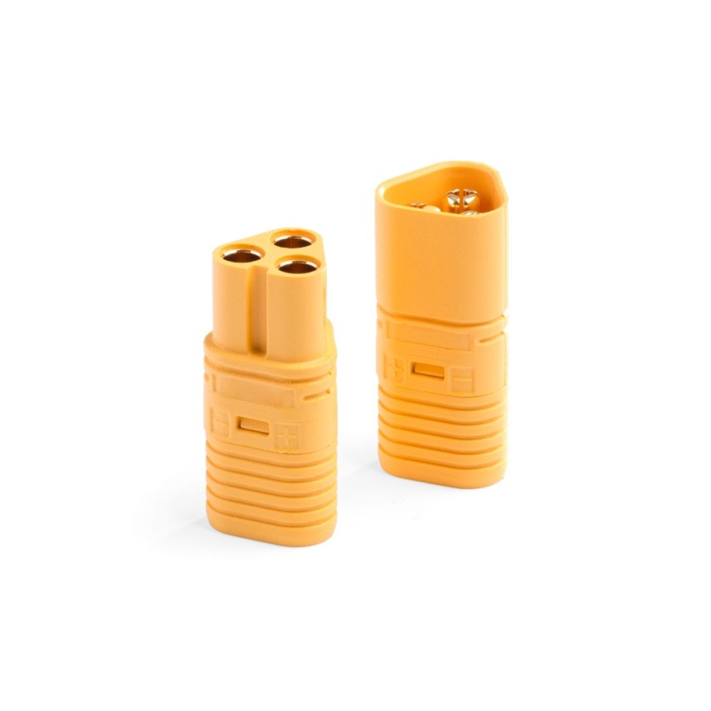 Tříkolíkový silový konektor se zlacenými kontakty se zatížitelností max. 60 A. Pro kabely o průřezu max. 3,3 mm2 (12AWG). Přechodový odpor 0,55 mOhm, max. 500 V. Ideální pro propojování střídavých elektromotorů a regulátorů. Balení 5 párů.