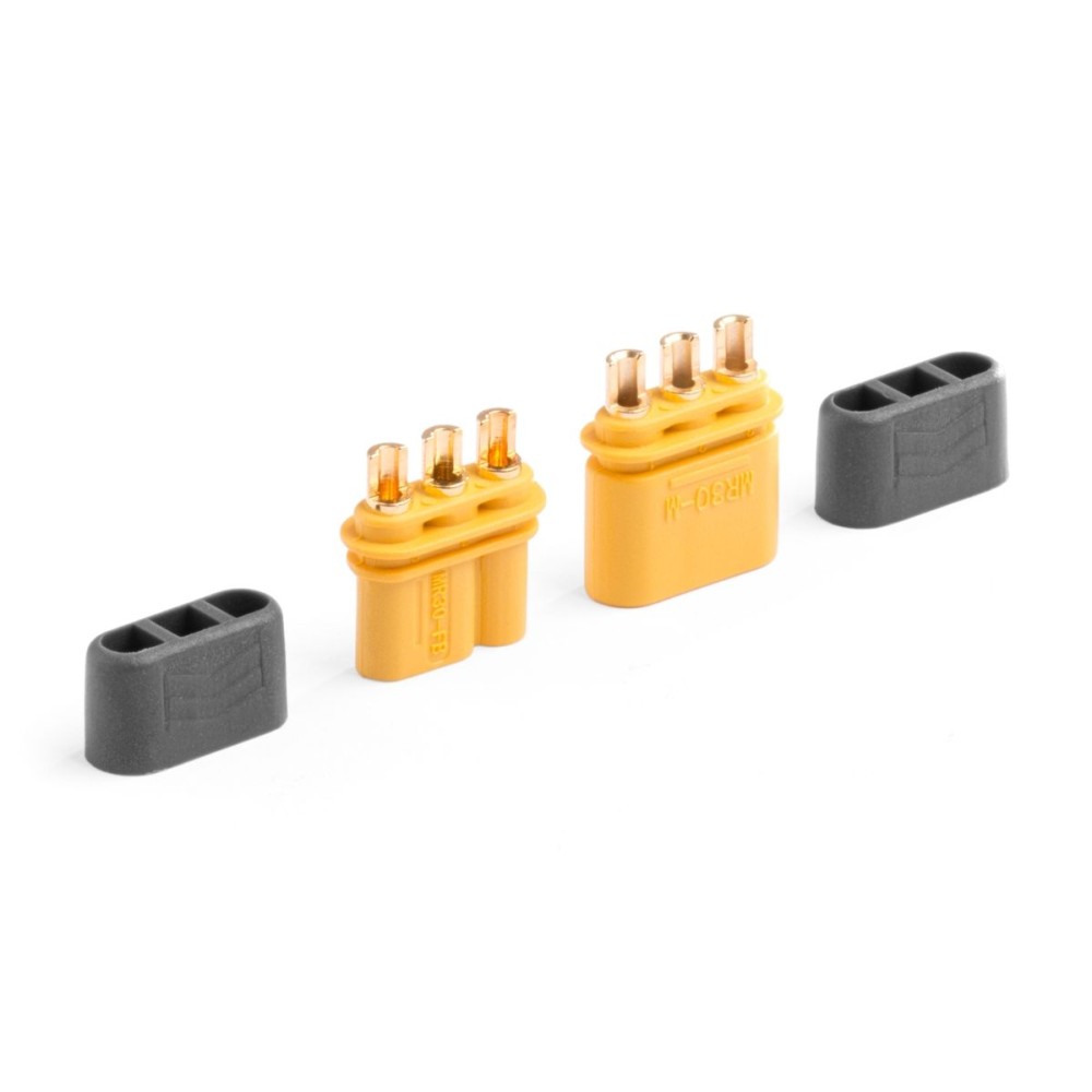 Tříkolíkolíkový silový konektor se zlacenými kontakty se zatížitelností max. 30 A a kryty kabelů. Pro kabely o průřezu max. 1,3 mm2 (16AWG). Přechodový odpor 0,70 mOhm, max. 500 V. Ideální pro propojování střídavých elektromotorů a regulátorů. Balení 5 párů.
