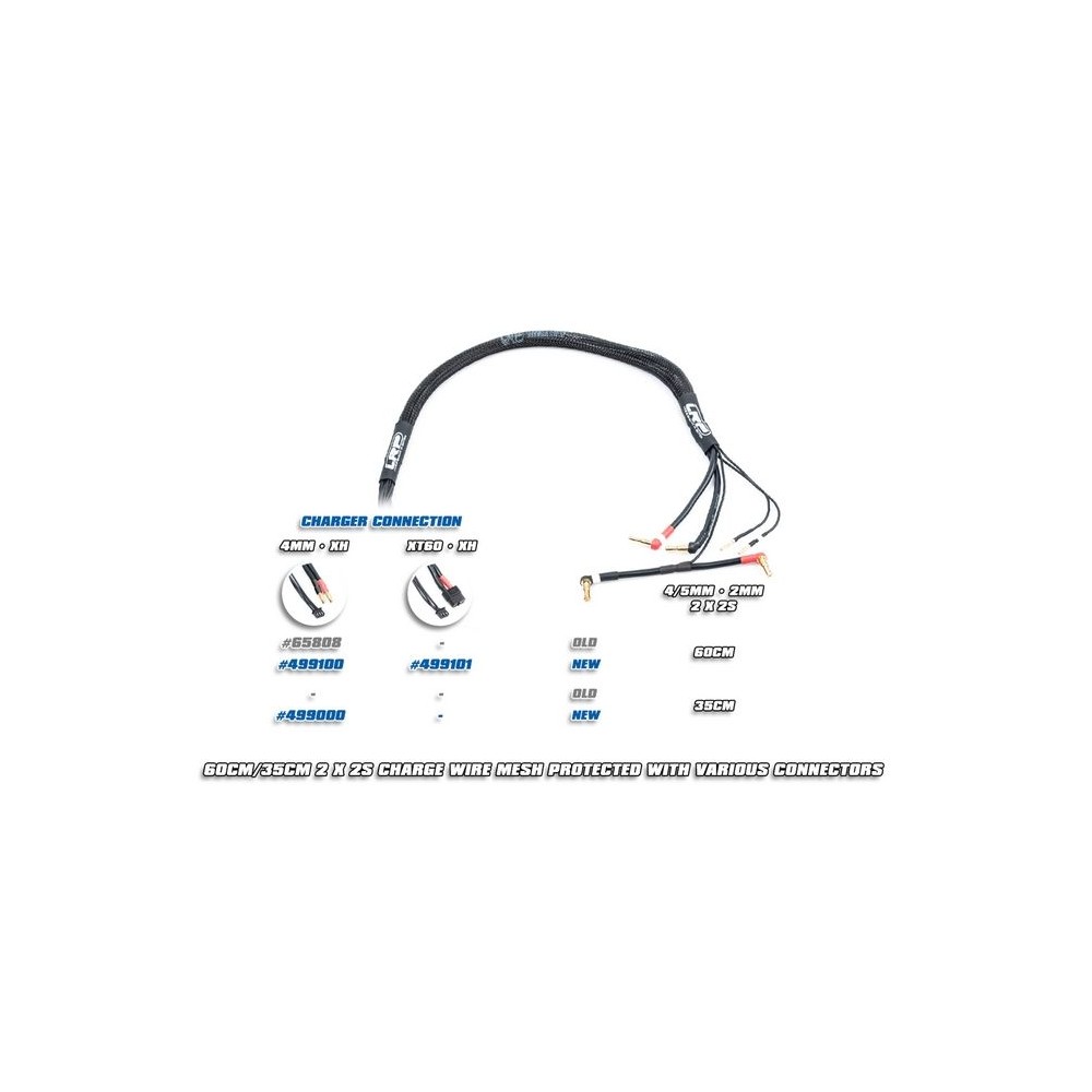 Tento 2x 2S nabíjecí kabel pro závodní hardcase akumulátory má délku 60 cm a je dodáván s 4mm banánky + XH balančním konektorem a G4/5 + G2 konektory pro akumulátory.