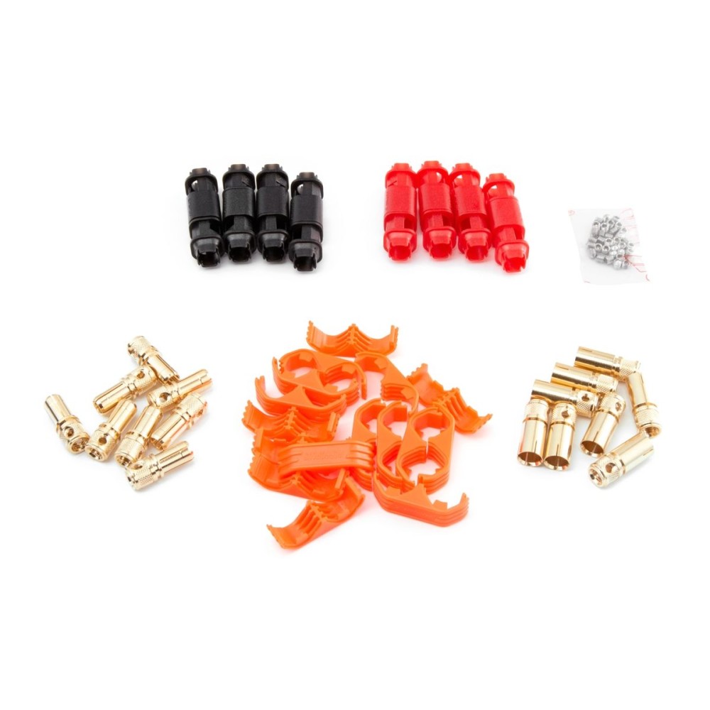 Zlacené 6mm konektory se společným domkem pro 8,4mm2 (8AWG) kabel. Konstantní proud 240A, špičkový 280A. Nepájecí varianta - kabel je zajištěn pomocí dvou imbusových červíků. Balení 8 párů (4 červené a 4 černé).