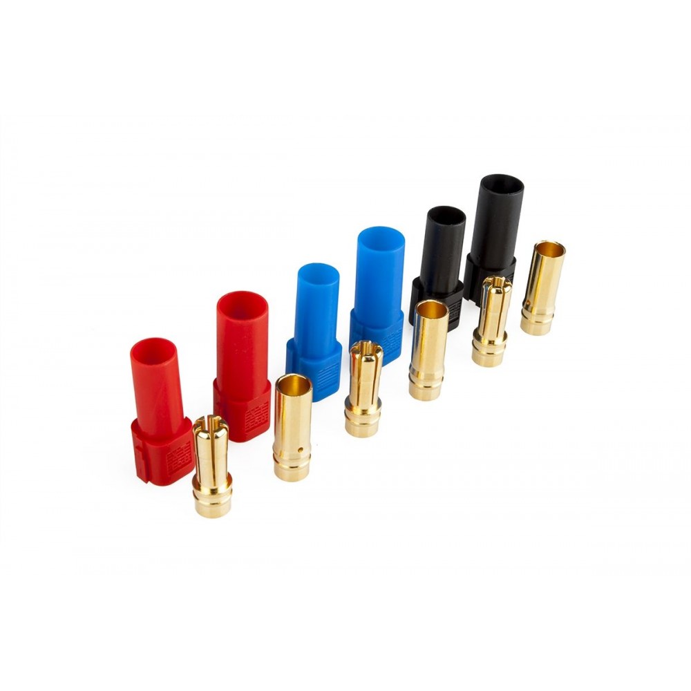 Silový konektor se 6 mm zlacenými kontakty se zatížitelností max. 100 A. Pro kabely o průřezu max. 8,4 mm2 (8AWG). Přechodový odpor 0,20 mOhm, max. 500 V. Balení 3 páry kontaktů s pouzdry v barvě červené, černé a modré.