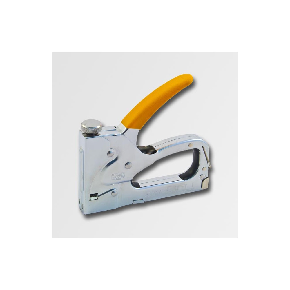 Profesionální celokovová sponkovačka umožňuje pracovat se 4 druhy sponek - čalounické sponky, hřebíky, kolíky a kabelové sponky. Splňuje certifikát TÜV a tím zaručuje bezpečnost výrobku. Všestranné použití do dílny, stavbu i domácnost. Možnost nastavení síly úderu dle materiálu pomocí šroubu. Je pomocníkem pro snadnější práci, což zajišťuje velký zásobník s rychlým plněním. Na sponkovačce najdete šroub pro nastavení síly úderu. Pogumovaná rukojeť umožňuje pohodlnější práci.