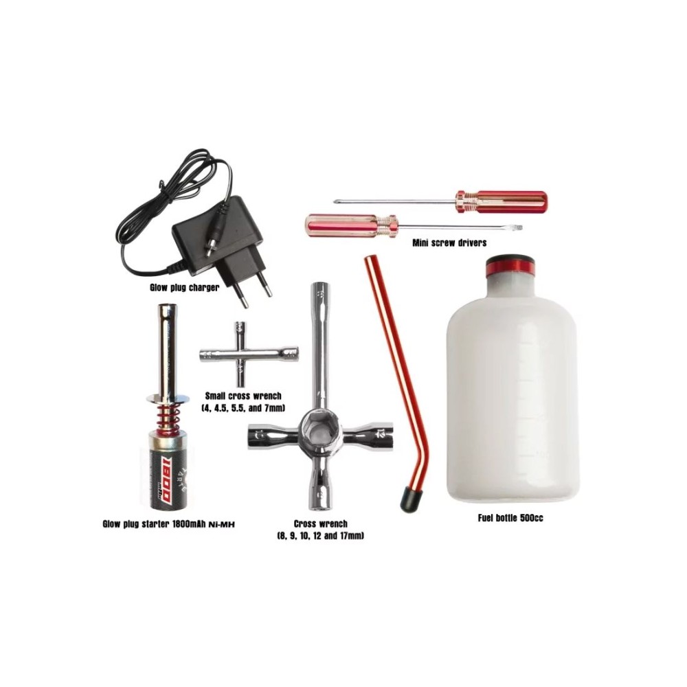 Sada obsahuje 500ml tankovací lahev, 1800mAh žhavítko vč. nabíječe, plochý a křížový šroubovák, velký klíč (8/9/10/12/17 mm) a malý klíč (4/4,5/5,5/7 mm).