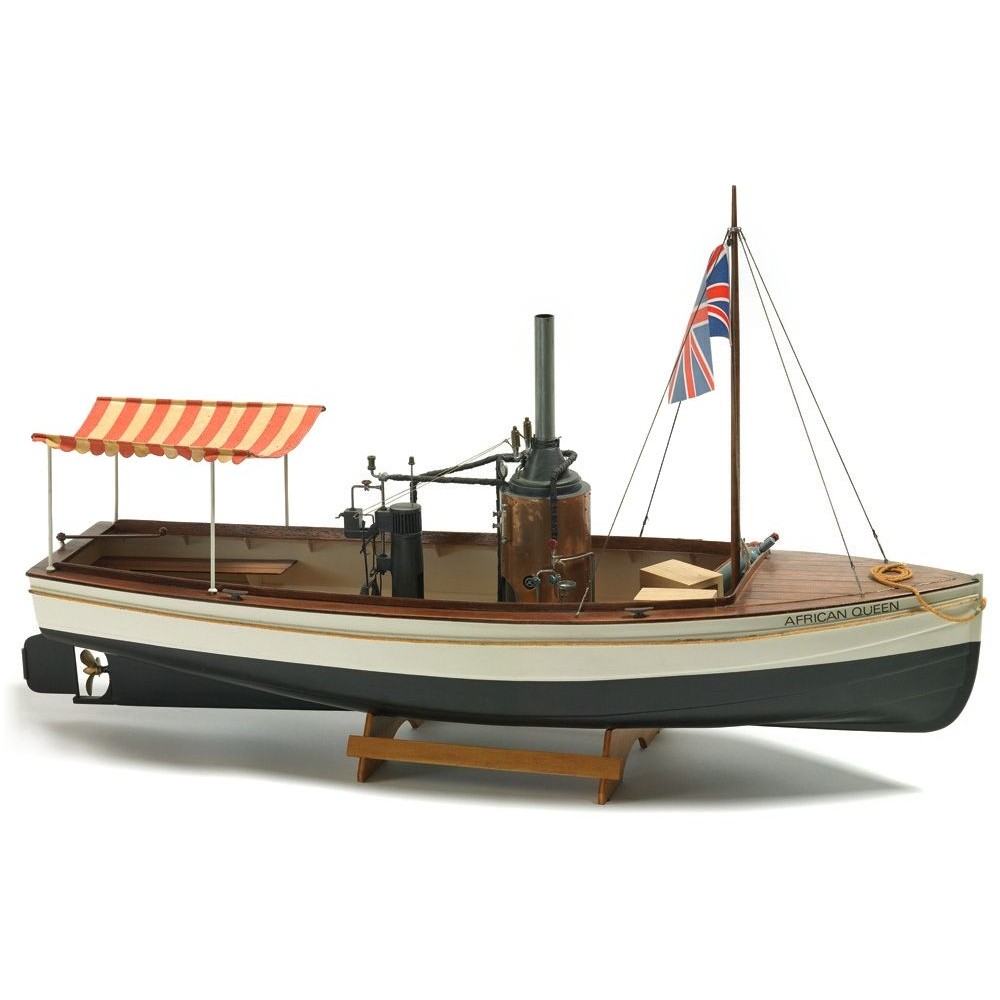 African Queen má trup tvořený plastovým výliskem s dřevěnou výztužnou konstrukcí a palubou. Pod maketou parního kotle a stroje snadno ukryjete pohonný elektromotor s regulátorem a akumulátorem. Stavebnice obsahuje všechny plastové a dřevěné díly potřebné pro dokončení modelu, maketové příslušenství, lodní hřídel s pouzdrem a lodní šroub.